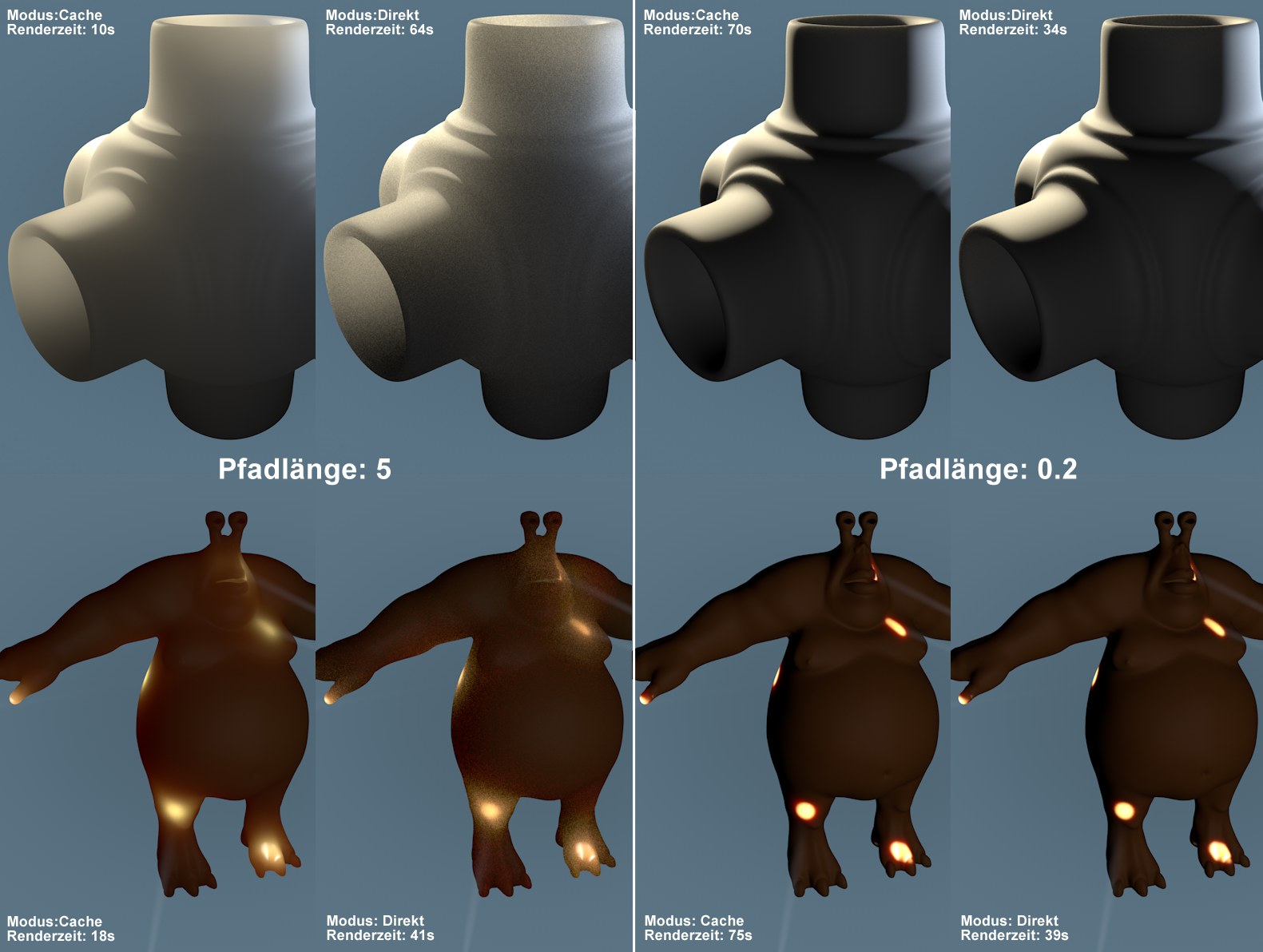 Dieser Modus funktioniert ohne Zwischenspeicherung und entspricht mehr einer "Brute Force"-Methode (so ähnlich wie sich bei GI der QMC- zum IC-Modus verhält). Hier wird also wenig getrickst, sondern für jedes Pixel die Beleuchtung berechnet. Das funktioniert besonders bei sehr kleinen Pfadlängen (z.B. Haut) erstaunlich schnell (viel schneller als bei Cache), ist bei großen Pfadlängen allerdings dann ziemlich langsam und mit viel Noise versehen.