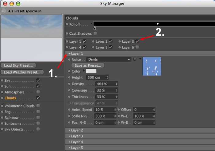 This setting lets you define a different starting point for the billowing defined in Anim. Speed. Let’s assume you have animated a cloud formation. Unfortunately, a part of the cloud formation will cover the sun at the very start of the animation. To remedy this, simply enter a different Offset value to alter the start of the animation.