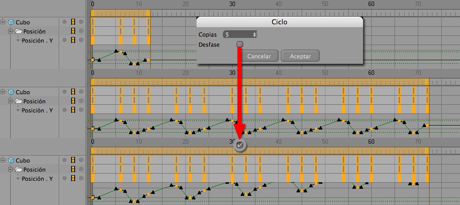 La animación inicial consiste en cuatro claves (arriba) la cual fue duplicada utilizando Ciclo. El desfase ha sido desactivado en la imagen del centro y en la imagen inferior ha sido activado.El comando Ciclo le permite repetir una animación tantas veces como precise. Para ello se duplicarán las claves a lo largo de la pista y alineados consecutivamente. La última clave será remplazada por primera del ciclo.