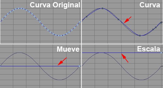 - Modo Mover / Escalar: Se crea una línea recta paralela al eje de tiempo desde la primera Clave (Mover) o la Máxima (Escala) partiendo de la Curva original.