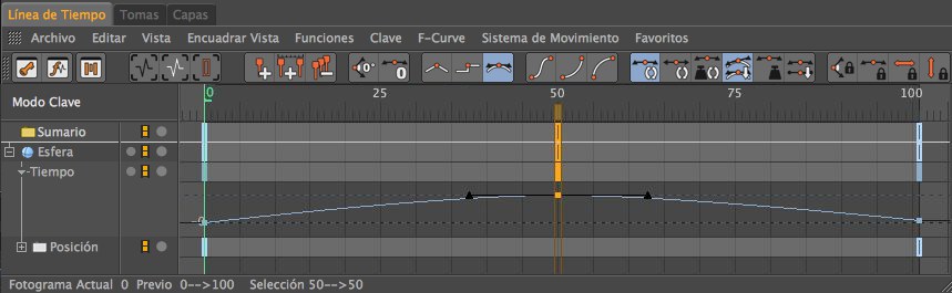 ¿Cómo se moverá la esfera ahora? Simplemente: La Pista de Tiempos establece su máximo valor de 100% en el fotograma 50; esto significa que la propiedad de la esfera que le fue asignada, Posición X, también establecerá su máximo valor de X=300 en el fotograma 50. Consecuentemente, a Pista de Tiempo retorna al valor 0% al finalizar la animación. La esfera retornará a su posición original teniendo por su lado dos claves, solamente , en la animación. La Curva de Tiempo determina la interpolación entre las dos claves.