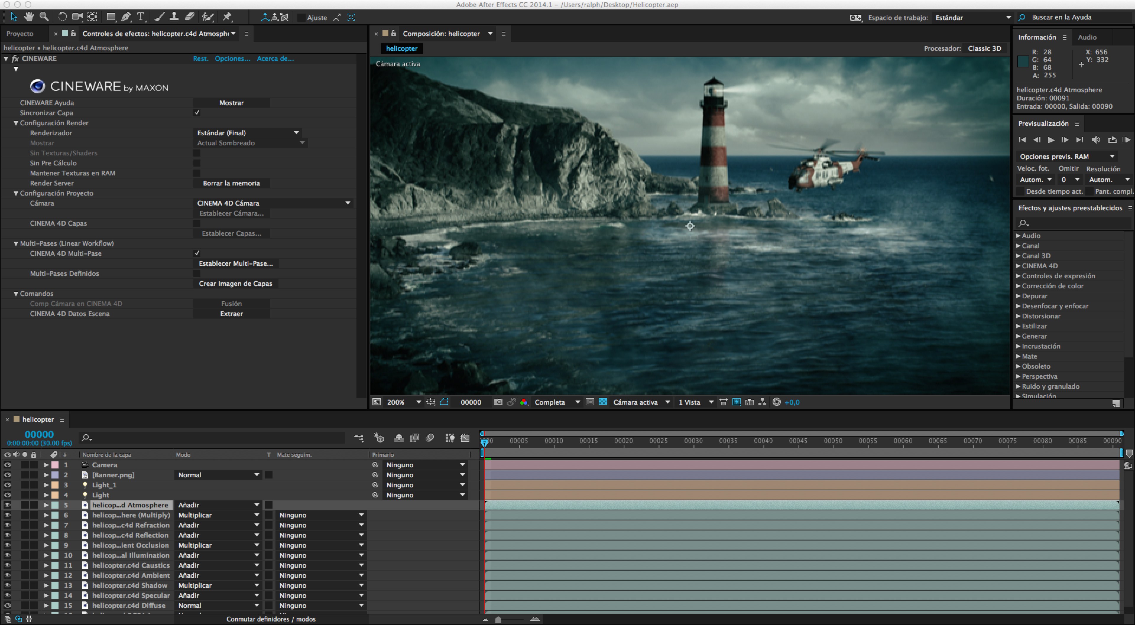 En la última versión de Adobe After Effects pueden cargarse elementos 3D complejos, escenas e incluso animaciones desde MAXON Cinema 4D a una composición After Effects. La integración sin igual de esas aplicaciones permite a los usuarios de After Effects crear impresionantes composiciones motion graphics más rápido y fácil que nunca.