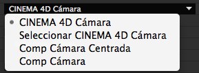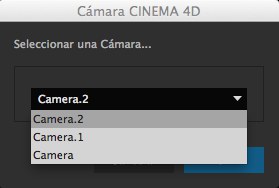 La opción Cinema 4D Camera usará la cámara activada actualmente en la escena de Cinema 4D. Usa la opción Select Cinema 4D Camera para seleccionar una cámara de Cinema 4D existente. Ten presente que sólo pueden seleccionarse las cámaras que estén incluidas en la escena de Cinema 4D.