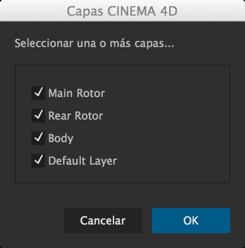 Si la escena de Cinema 4D contiene capas, aquí pueden seleccionarse. Sólo se usarán los elementos de la escena de Cinema 4D que estén asignados a esta capa de Cinema 4D. Esto permite mostrar de forma individual grupos de objetos en las capas Cinema 4D de After Effects.