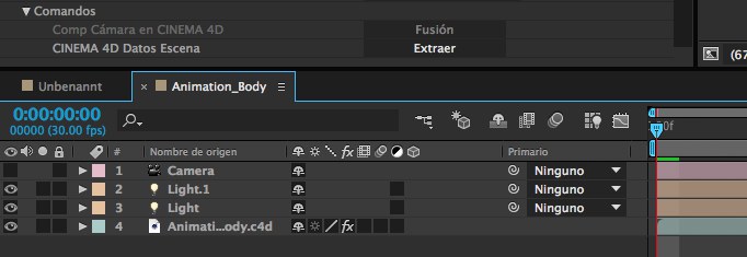 Todas las cámaras y luces de una escena de Cinema 4D dada, incluyendo sus animaciones y propiedades, se transferirán a la composición de After Effects como capas en la Línea de Tiempo. Además, los marcadores de la línea de tiempo de Cinema 4D son asumidos en la línea de tiempo de After Effects.