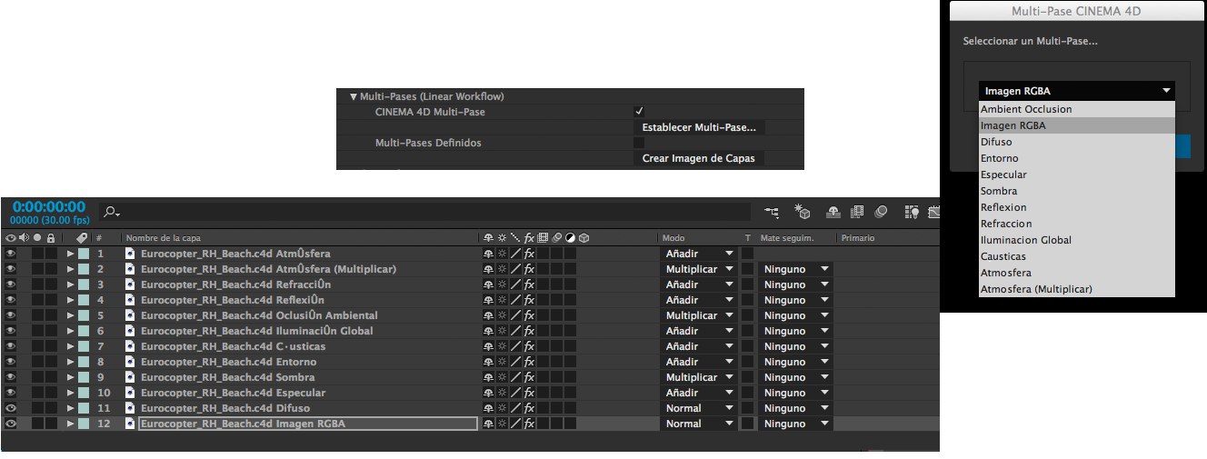 Si se pulsa el botón Add Image Layers sin tener activada la opción Define Multi-Passes, se extraerán a la Línea de Tiempo todos los multipases existentes.