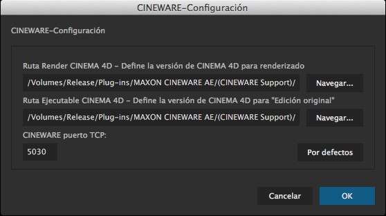 Aquí es donde se define el puerto de comunicaciones entre CINEWARE y el renderizador de Cinema 4D integrado (CINERENDER). Si este ajuste se modifica por algún motivo, After Effects deberá reiniciarse.