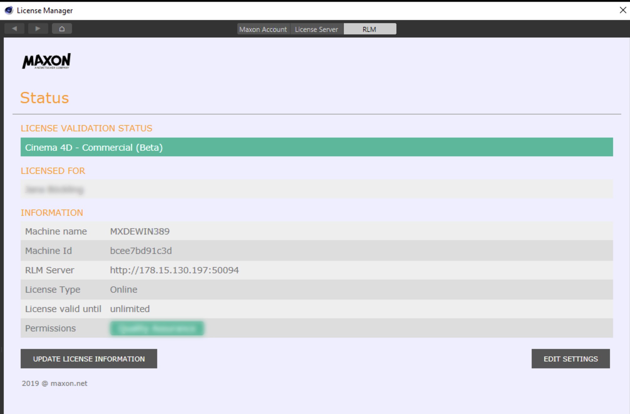 - MacOSX: /Applications/MAXON/RLM/