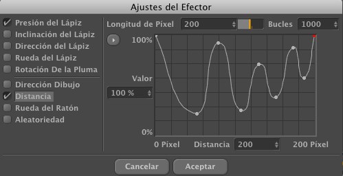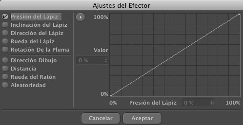 Un efector te permite cambiar el parámetro de forma dinámica por medio de un método de entrada específico. Por ejemplo, puedes usar la presión para cambiar el tamaño del pincel mientras pintas. La mayor parte de los métodos de entrada tienen una gráfica que puedes editar para refinar su comportamiento.