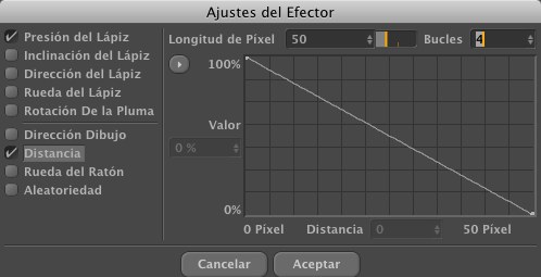 Esta función especial hace desvanecer la pincelada – asigna Distancia al parámetro presión del pincel y tu pincelada se desvanecerá de forma gradual. La Distancia de Píxel define el área de influencia del efector.