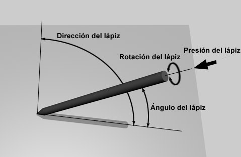 Esta es la dirección hacia la que apunta el lápiz, por ejemplo de arriba a la derecha, hacia abajo a la izquierda mientras ves la tableta directamente desde encima.
