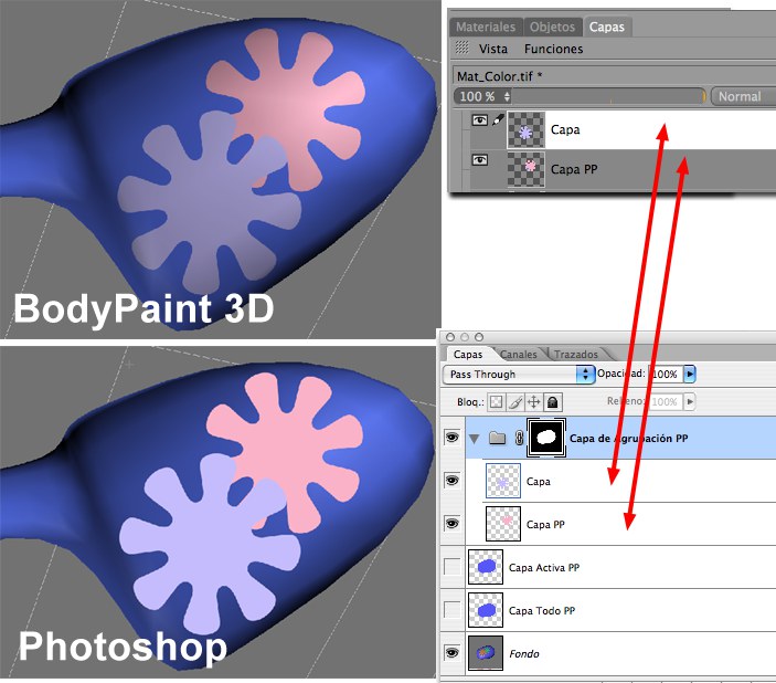 El fichero .psd puede ser cargado de nuevo en las aun capas temporales en Cinema 4D / BodyPaint 3D después de que hayan sido editadas. Para hacer esto simplemente usa el comando Mezclar Textura (clic derecho sobre una capa: Textura / Fusionar Textura). Esto te permite cambiar texturas discretamente en el modo pintado de proyección usando Photoshop.