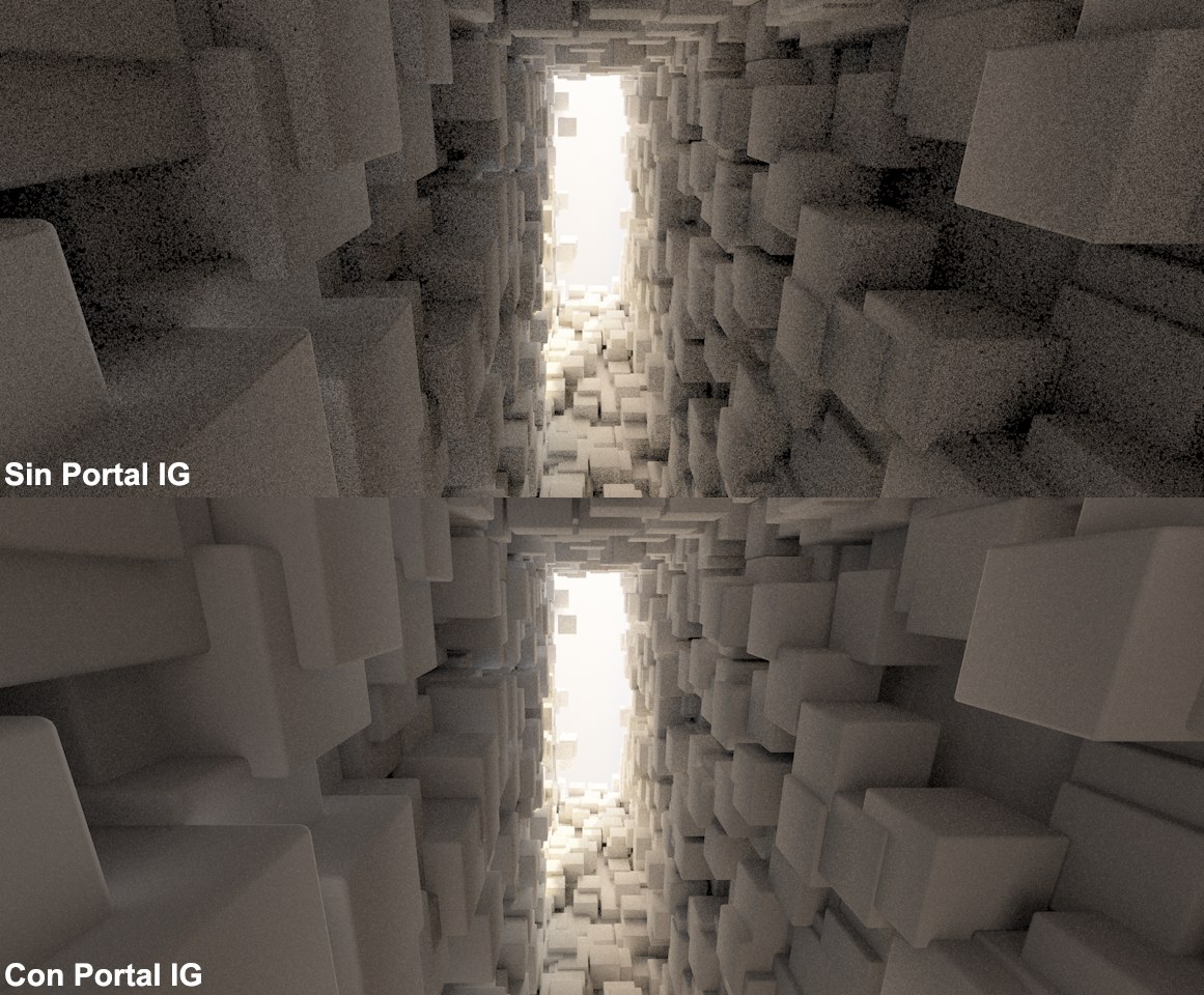 Calidad mejorada con el uso de Portales IG. Arriba un render QMC con Profundidad de Difusión ajustada a 2. La imagen superior tarda el doble de tiempo en renderizarse que la de abajo, donde se ha empleado un Portal IG con menos Muestras.
