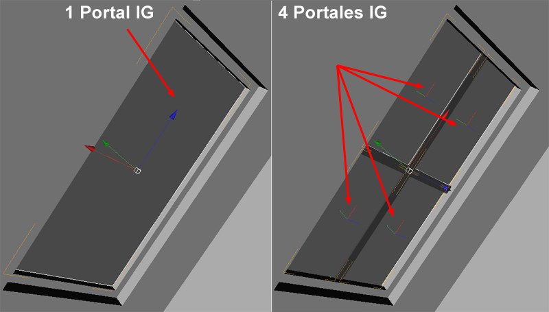 Los Portales IG son generalmente superficies de un único polígono (por ejemplo, una Primitiva Plano) que se coloca en la posición por la que la luz entra en la habitación a través de una abertura relativamente estrecha. La dirección en la que miran las normales es irrelevante. Ajusta la forma de cada Portal IG para igualarse a la ventana o abertura correspondiente. Si un Portal IG es muy grande, por ejemplo si toma parte del muro donde está la ventana, pueden aparec artefactos (se nota particularmente en el modo QMC). Los Portales IG imprecisos dan como resultado mas "grano" y una IG menos precisa.