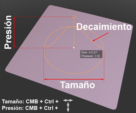 - Botón central del ratón + arrastrar derecha/izquierda (o Mayus+Ctrl): ajustar el tamaño del pincel.