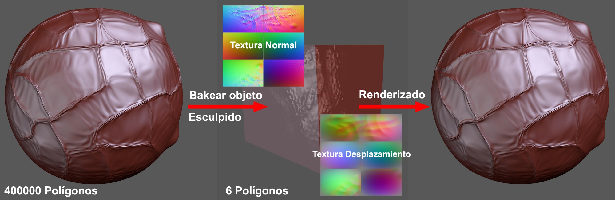 Sencillo: los detalles se bakean en texturas y se proyectan sobre objetos de baja resolución (concretamente los objetos a partir de los que Esculpir, también empleando cálculos internos, crea los objetos de alta resolución). Los objetos se renderizarán con todo detalle.