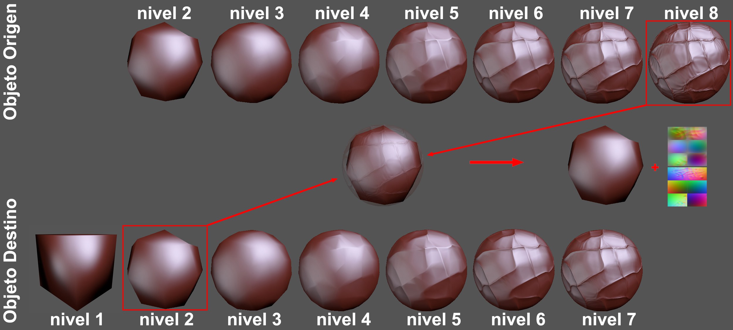 Los detalles de objetos de alta resolución (objetos Origen) se transfieren mediante texturas a objetos de baja resolución (objeto Destino).