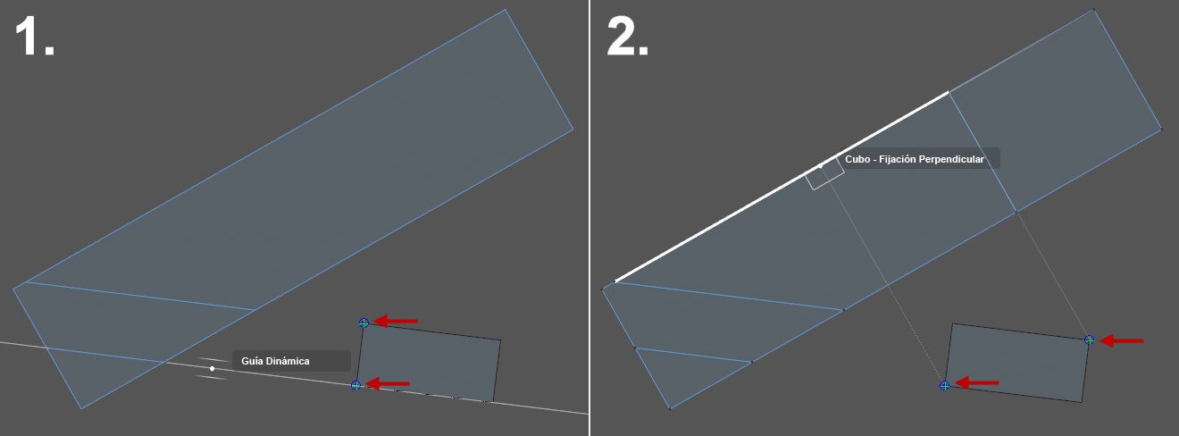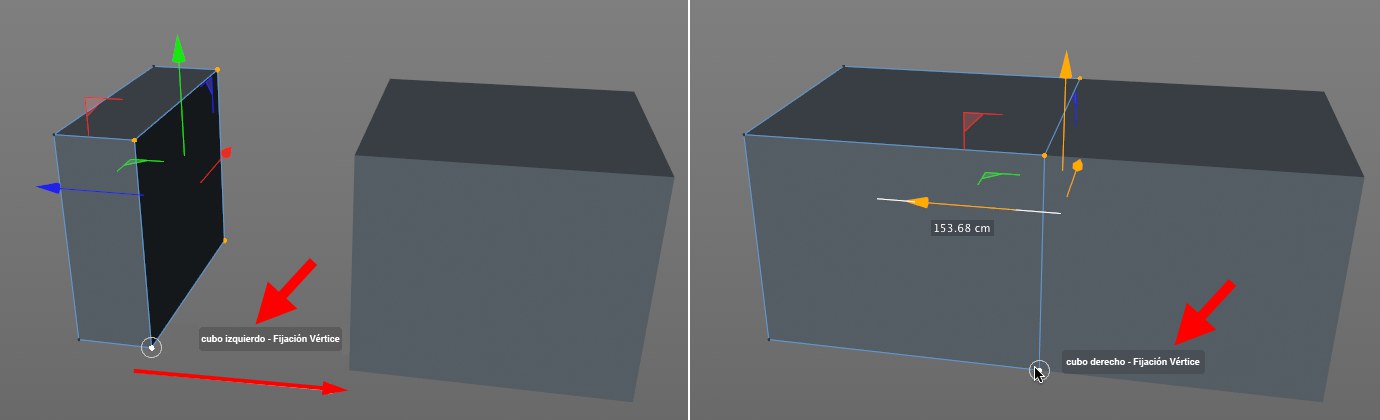 - Ahora arrastra la selección al vértice superior izquierdo de la cara posterior del cubo de la derecha y mantén el ratón en esa posición alrededor de 0.5 segundos. Acabas de crear 2 puntos de referencia.