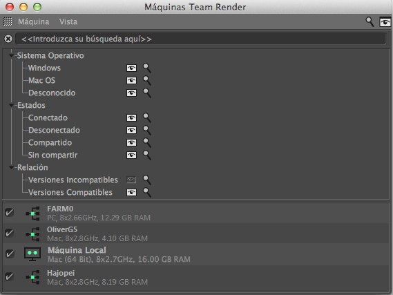 Todos los ordenadores verificados (en verde) pueden tomar parte del renderizado. En esta imagen se muestra la barra de búsqueda y los filtros.