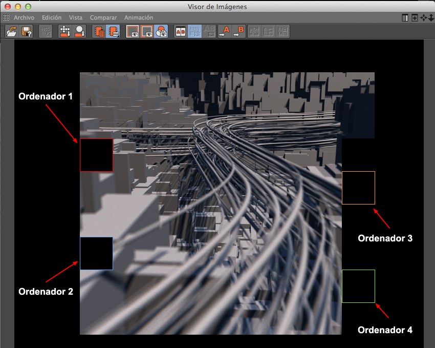 Se han usado 4 ordenadores para renderizar una imagen fija (los distintos colores de los buckets se deben a la opción Si se usa Team Render para renderizar una animación, cada ordenador cliente renderizará un fotograma de animación completo.