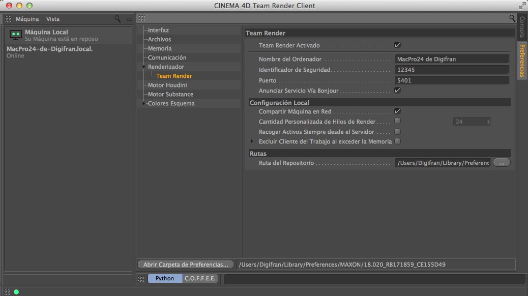 El campo de abajo Python no es una función especial de Team Render sino un punto de acceso general a Python API (más detalles sobre Python pueden encontrarse en http://developers.maxon.net).