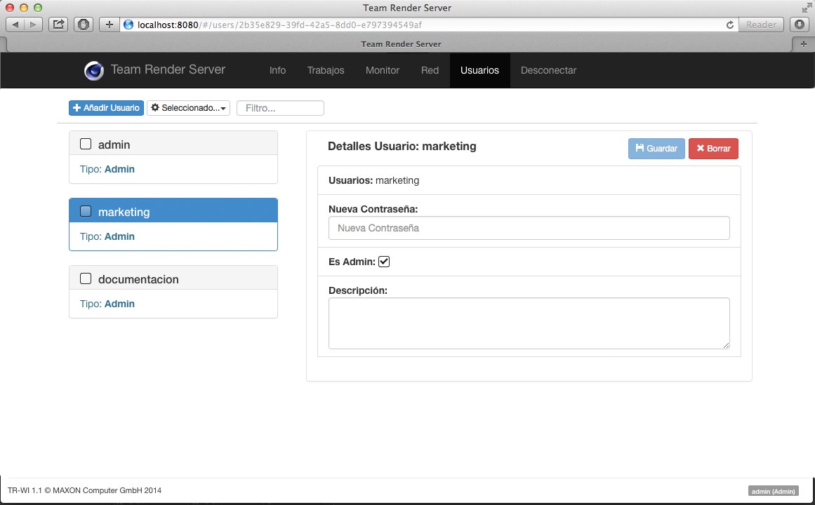 Una vez se ha añadido el usuario, él/ella pueden loguearse en el Servidor de Team Render usando la información proporcionada (dirección navegador: ver Interfaz Navegador) y gestionar los trabajos de render.