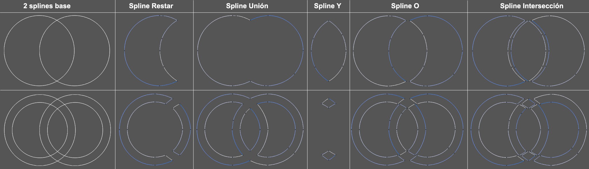 Ya debes estar familiarizado con el generador Máscara de Spline, un Objeto Booleano para splines. Los siguientes comandos pueden usarse si quieres utilizar la misma función sin el generador.