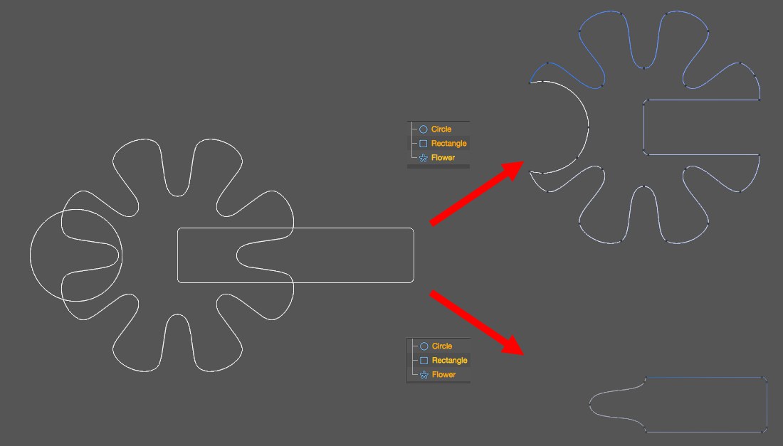 Tenga en cuenta que el orden de selección general de todos los splines implicados en tal operación también puede tener un efecto en el orden de punto de la spline que se produce (¿Deberían el círculo o rectángulo ser cortados de la flor de primera? En el ejemplo anterior era el círculo, por lo que el spline resultante también comienza en el círculo).