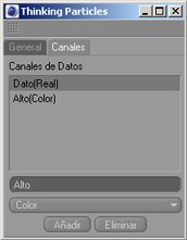 Aquí puedes crear canales de datos que permiten transferir valores personalizados a la expresión Thinking Particles.