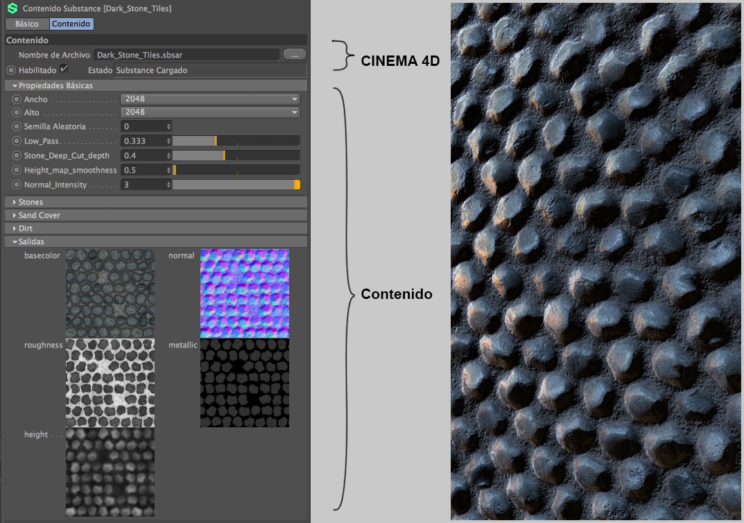 Si se define acordemente en el Substance Designer, las texturas también pueden cargarse en Cinema 4D dentro del Contenido y aplicar nodos a ellas (es suficiente con utilizar un nodo Color Image Input en el Substance Designer, que mostrará como una textura puede cargarse en la pestaña Image Inputs del Contenido), a través del cual se pueden crear innumerables efectos.