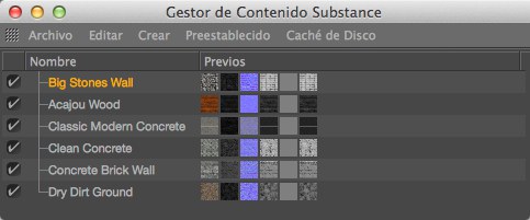 El Gestor de Contenido Substance almacena y administra todos los Substances y Contenidos cargados. Los elementos de la lista se pueden arrastrar a una nueva posición y seleccionar de la misma manera que otros elementos se seleccionan en Cinema 4D (Ctrl/Cmd para seleccionar o anular la selección de elementos individuales o múltiples; May para seleccionar un rango de items; Del para eliminar una selección). Un Contenido puede renombrarse haciendo doble clic sobre él.