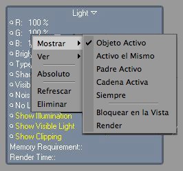 Activo del Mismo Tipo: cuando cualquier objeto del mismo tipo está seleccionado. Por ejemplo, los elementos HUD de una luz se mostrarán cuando selecciones cualquier luz de la escena. Esto permite ajustar los parámetros de múltiples objetos - como el brillo de múltiples luces - usando un único elemento HUD.