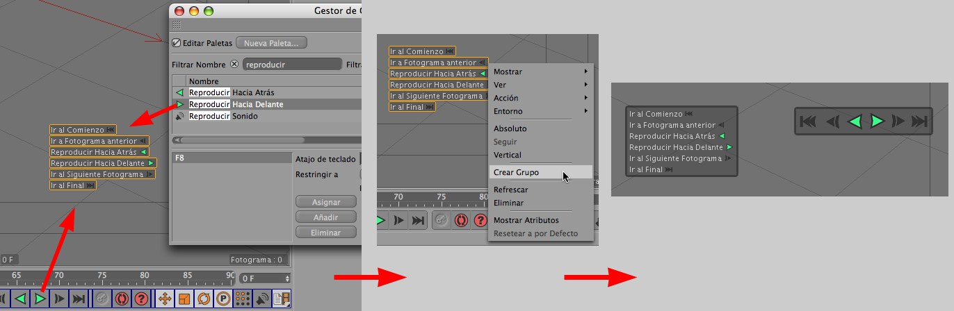 Una breve descripción de cómo crear un grupo HUD de comandos conteniendo las opciones de reproducción de la Barra de Herramientas de Animación: