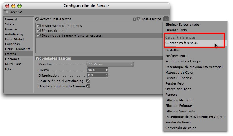 Las opciones Guardar Preferencias y Cargar Preferencias permiten guardar y cargar efectos preestablecidos a y desde el directorio Preestablecidos / Usuario en el Gestor de Contenido. Esos preestablecidos también pueden borrarse desde el Gestor de Contenido.