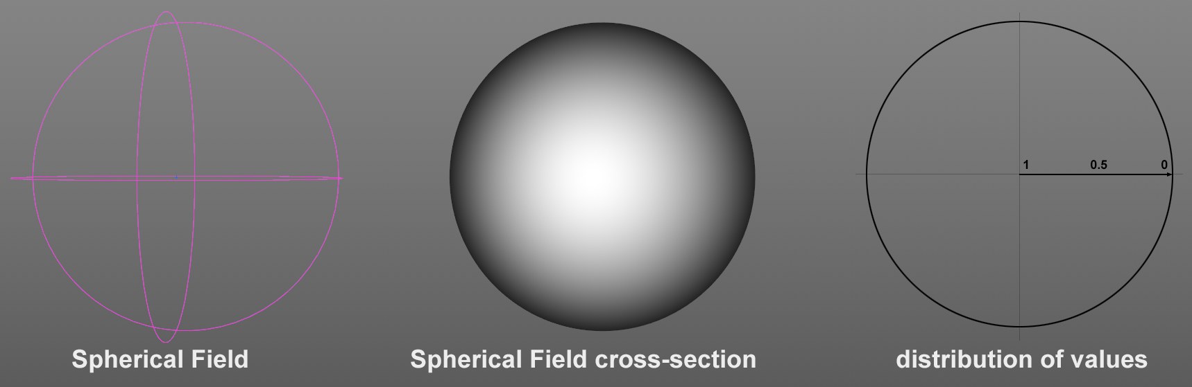 Algo así como un ruido tridimensional que define la intensidad de un efecto utilizando su gradiente de escala de grises. El efecto es más fuerte donde el ruido es blanco y más débil donde es negro, y los valores de escala de grises tienen una influencia correspondiente. El campo más simple es el campo esférico: