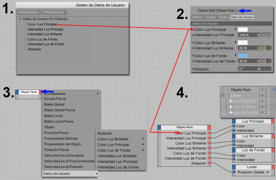 Estos Datos de Usuario en este Objeto Nulo de la escena controla el color, el brillo y la orientación de tres fuentes de luz.