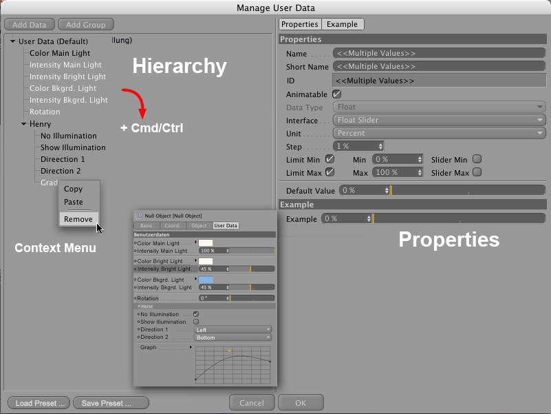 A veces, las escenas complejas contienen una gran cantidad de objetos. Cuando damos ese tipo de escenas a otros usuarios para que las modifiquen (por ejemplo poniendo los huesos en un personaje que necesita ser animado) es recomendable crear Datos de Usuario que afecten a los objetos de la escena mediante Expresiones XPresso (no te asustes, son expresiones muy simples). Así los siguientes usuarios que vayan a modificar la escena, sólo podrán ver los parámetros que necesitan para hacer los cambios que les correspondan en la escena. En la mayoría de los casos, se puede crear un Objeto Nulo y asignársele una Etiqueta XPresso donde sea almacenarán los Datos de Usuario. Sin embargo, los Datos de Usuario pueden asignarse a cualquier elemento que se muestre en el Gestor de Atributos. Los Datos de Usuario que se guardan en una escena y pueden copiarse a otras escenas.