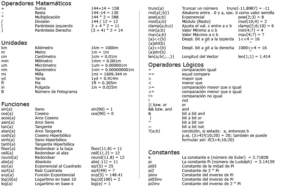Pueden escribirse fórmulas para la primitiva spline Fórmula y para el deformador Fórmula. De hecho, pueden escribirse fórmulas en cualquier lugar donde Cinema 4D acepte valores, como en el Gestor de Atributos. Este apéndice lista todas las unidades, operadores, funciones y constantes que pueden usarse en las fórmulas. Los valores se introducen usando cualquiera de las unidades listadas abajo (ejemplos entre paréntesis) - sin importar las unidades básicas definidas en las preferencias (Cinema 4D convertirá las unidades automáticamente).