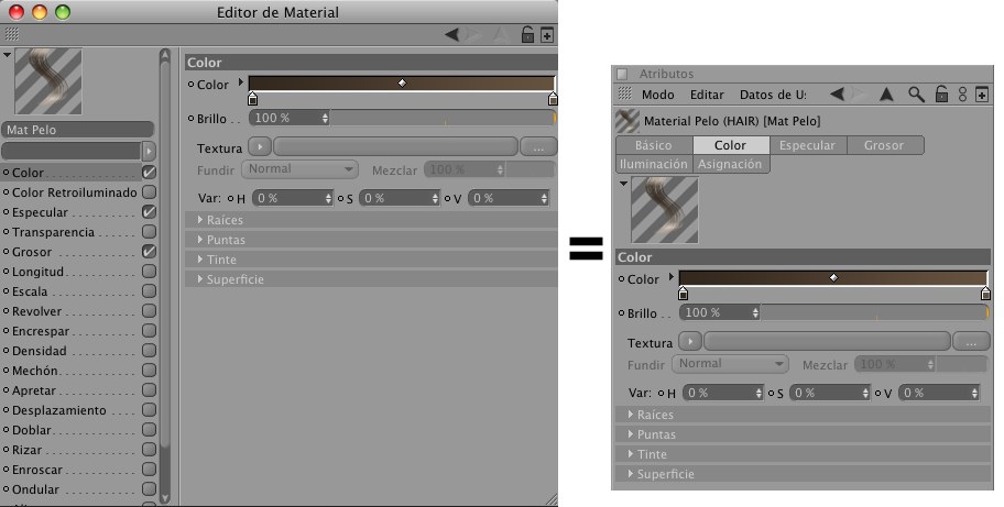 Tal y como sucede con otros materiales en Cinema 4D, el material Pelo también puede editarse tanto en la ventana del Editor de Materiales (doble click sobre el material Pelo) o en el Gestor de Atributos. Se ha usado el Editor de Materiales para las siguientes descripciones y pantallazos.