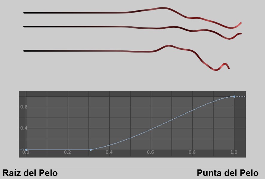Pueden usarse Gráficas de Funcion para ajustar la fuerza de influencia de un canal a lo largo del pelo. La parte izquierda de la gráfica representa la raíz del pelo, la derecha representa la punta del pelo. En el ejemplo de arriba, el Encrespado del pelo se definió usando una curva. La mitad izquierda de la curva tiene un valor de 0, es decir, el pelo permanece en línea recta. El valor de la curva se incrementa a la derecha, produciendo que el pelo se Encrespe más y más hacia la punta. A menudo, esta curva tiene un parámetro aparte que permite fijar un valor máximo para el canal.