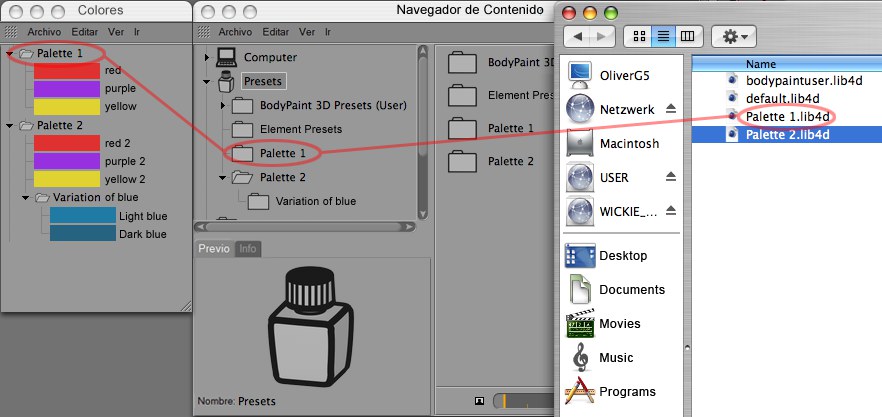 - Los Preestablecidos para BodyPaint 3D R2.5 y posteriores (los que estén como archivos *.lib4d) serán , al ser seleccionados para su uso, copiados en tu directorio de la biblioteca y simultaneamente abierto en los Preestablecidos de Color.