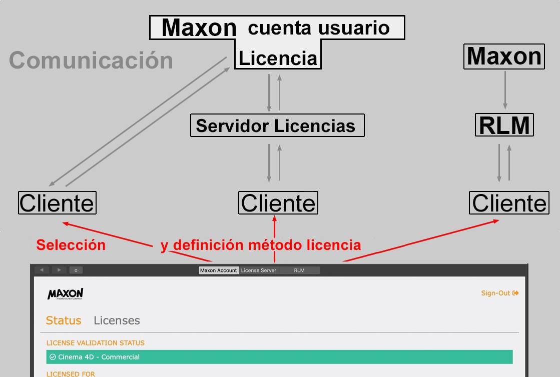 - Las licencias de Maxon License Server que están instaladas en un servidor de licencias de Maxon en una red de la compañía, que asignan las licencias a clientes individuales. El servidor de licencias debe conectarse a Internet de vez en cuando.