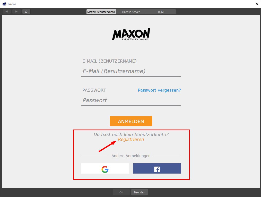Este es un ejemplo de cómo puede verse la ventana de diálogo del Sistema Maxon Lisense (la suya puede verse ligeramente diferente): use el enlace de registro resaltado (o la cuenta de Facebook / Google) para configurar una cuenta de usuario de Maxon.
