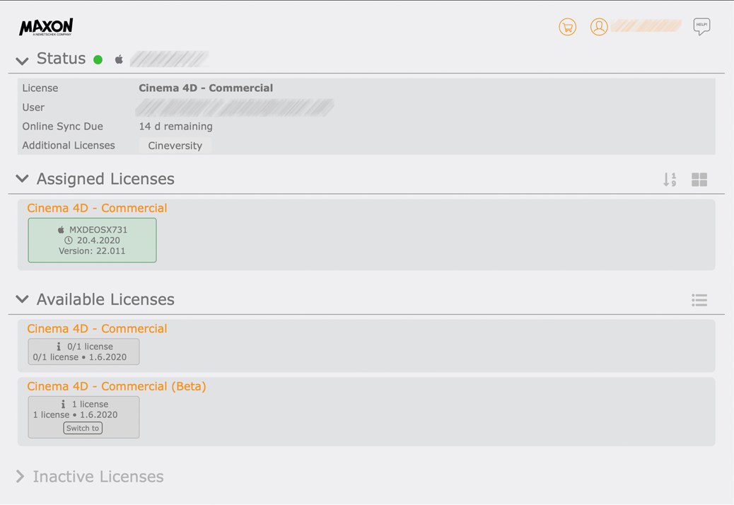 Si tiene instalado Cinema 4D en más computadoras que las permitidas por la licencia, una licencia puede tener una pequeña "x" en la parte superior derecha (excepción: este botón no se mostrará para las licencias del servidor de licencias y cuando acceda a la cuenta de usuario de Maxon desde una fuente externa, este botón aparecerá para todas las licencias normales). ¿Qué sucede cuando haces clic en este icono? Está diseñado para retirar las licencias de las computadoras a las que tiene acceso directo. Las licencias liberadas se pueden reasignar. La versión Cinema 4D con las licencias retractadas pronto dejará de funcionar o mostrará un mensaje de error cuando se reinicie la aplicación.