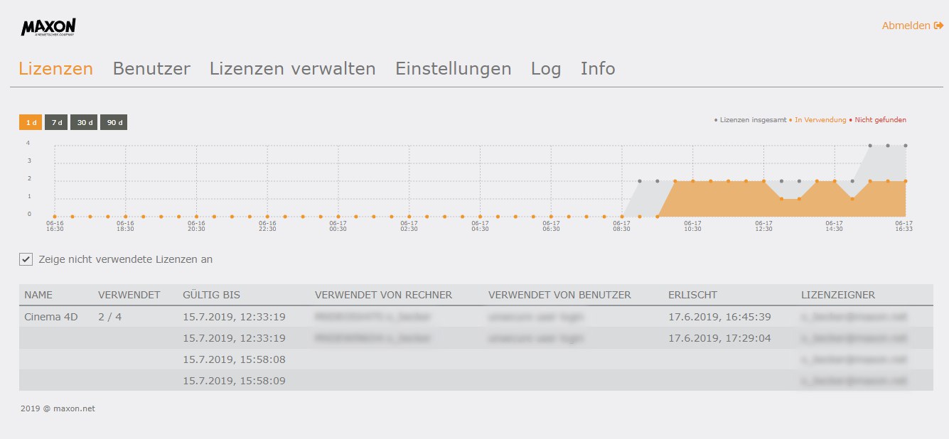- Caduca: la fecha antes de la cual el servidor de licencias debe ponerse en contacto con la cuenta de usuario de Maxon para extender el período de arrendamiento (consulte también Válido hasta). No mezcle esta caducidad con la función Válido hasta en el menú Licencias, donde Válido hasta tiene la misma función que Vence.
