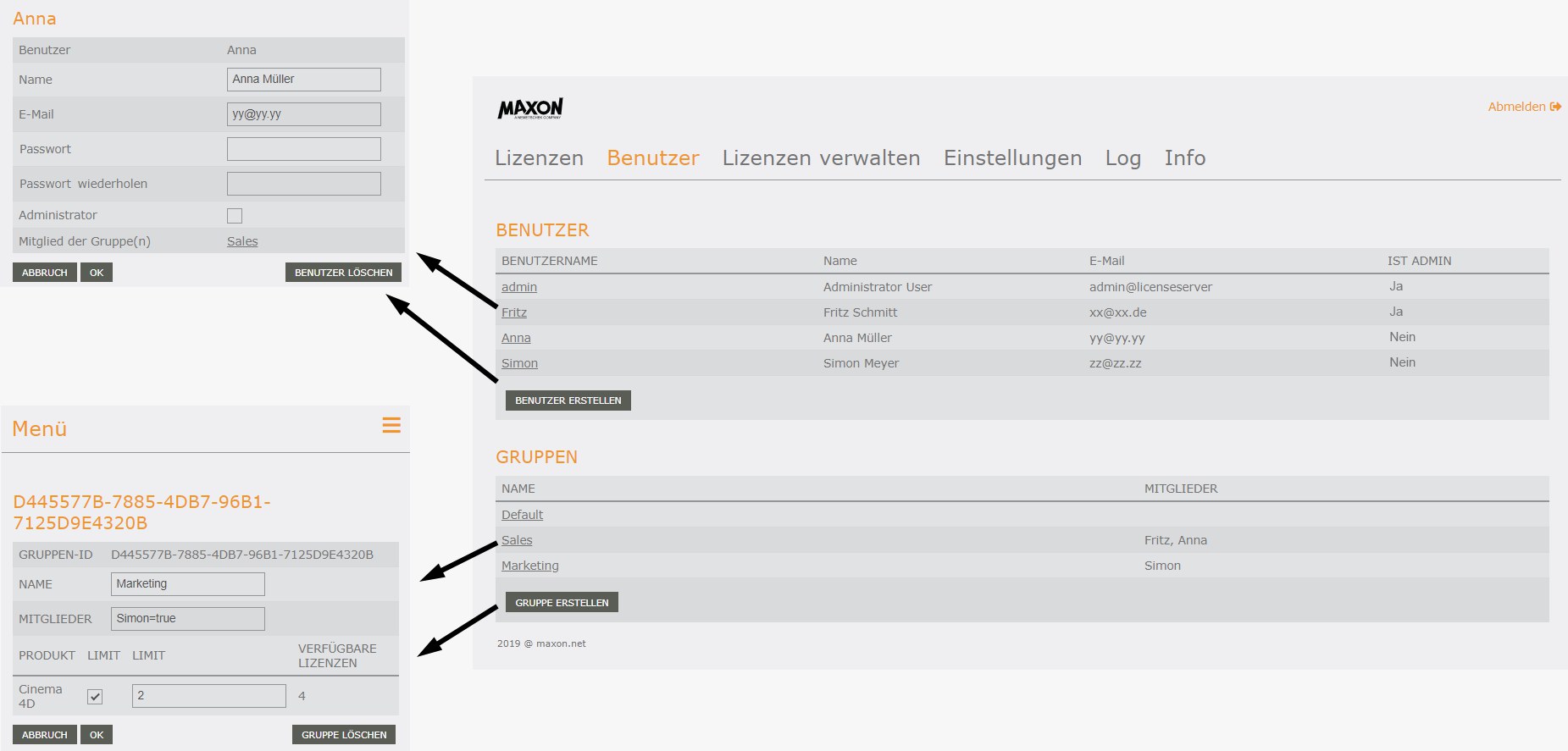 En esta página, se pueden crear usuarios y grupos. Los usuarios pueden ser asignados a grupos. ¿Para qué se puede usar esto? Imagine que tiene 3 licencias de servidor de licencias. Su empresa tiene un departamento de marketing y ventas, cada uno con 5 empleados que utilizan Cinema 4D de vez en cuando. Es posible que tenga un problema si el departamento de marketing usa las 3 licencias simultáneamente y el departamento de ventas no tiene nada. Para solucionar este problema, puede crear 2 grupos: marketing y ventas. A cada grupo se le puede asignar un máximo de 2 licencias. Problema resuelto.