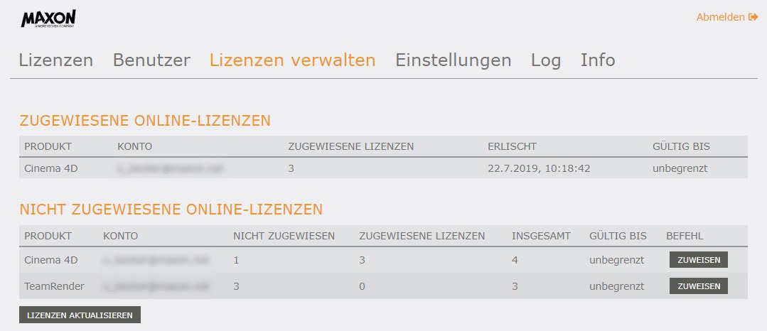 Las columnas Asignadas y Sin asignar se refieren solo a las licencias asignadas desde la cuenta de usuario de Maxon al Servidor de licencias y no a las licencias de Cliente asignadas desde el Servidor de licencias (esta información se puede encontrar en el menú Licencias). "Asignado" significa que el servidor de licencias puede distribuir esta licencia.