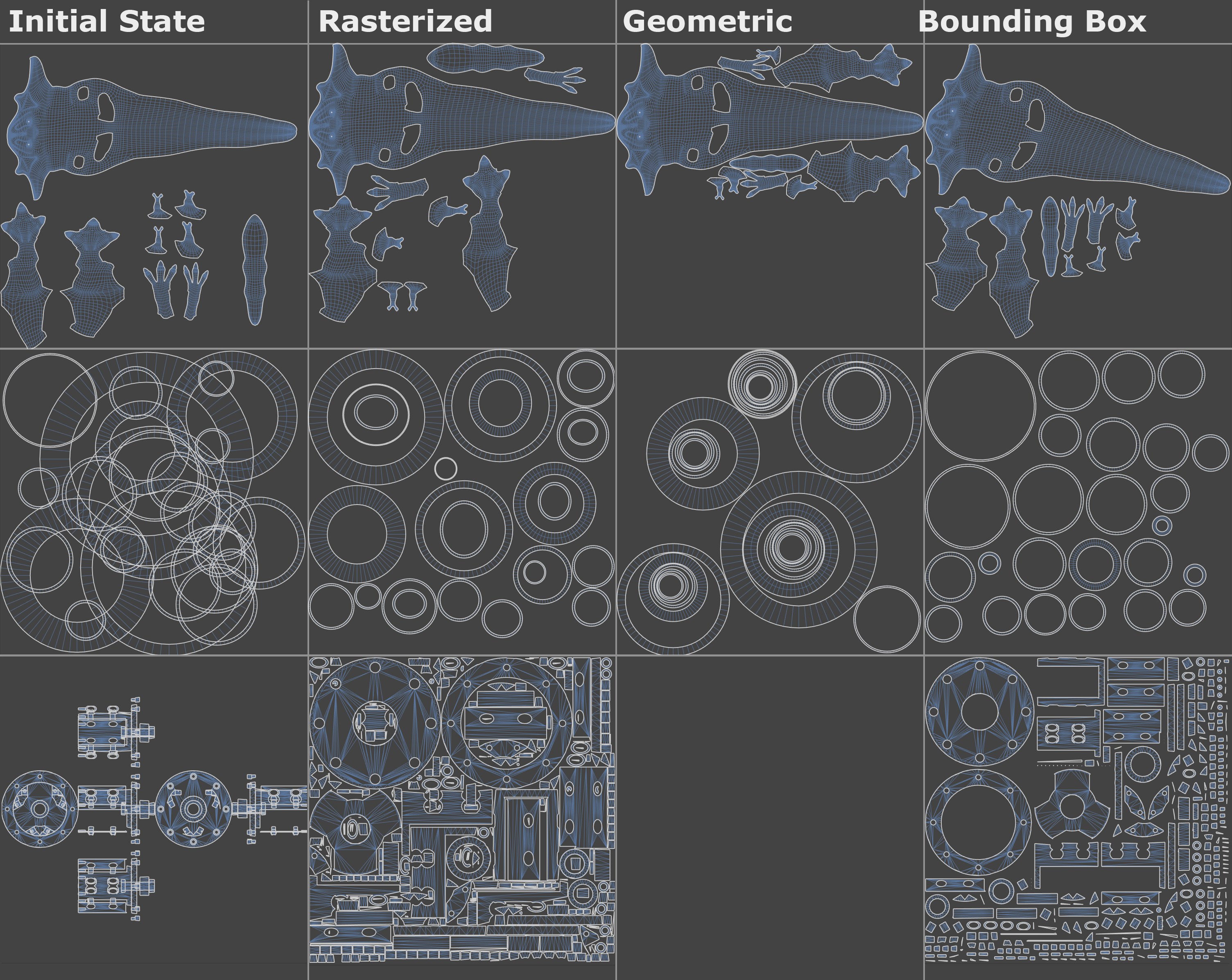 Los 3 modos con diferentes mallas UV. A la izquierda de cada imagen, el estado UV inicial antes de empacar.