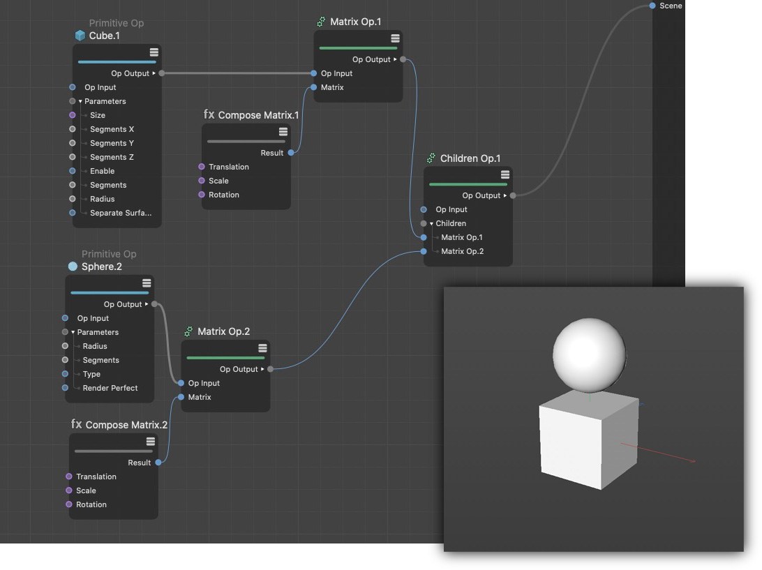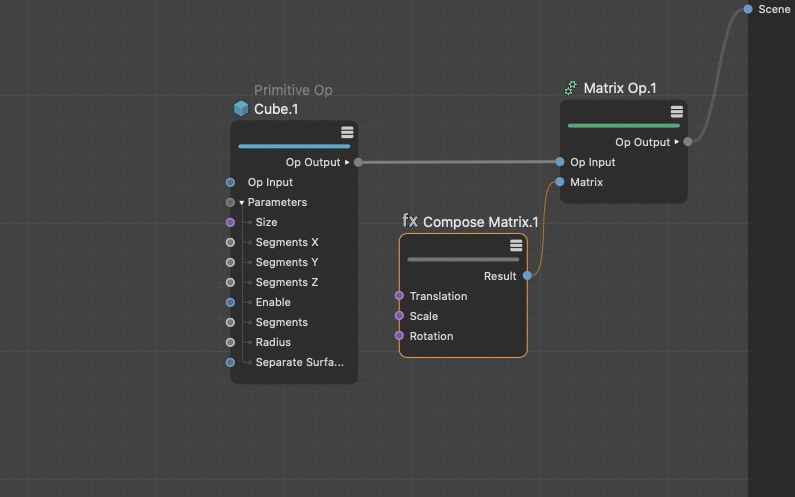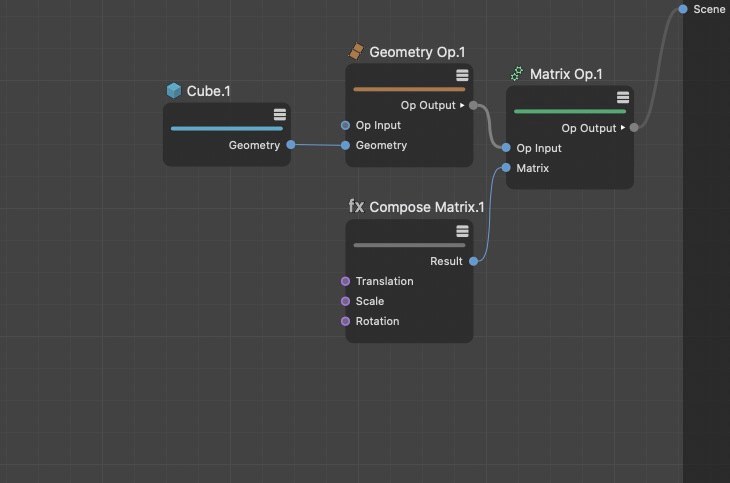 Se utiliza un nodo primitivo para generar un cubo. La salida de este Nodo se puede conectar directamente con la Escena Root pero primero agregamos nuestra propia matriz, para poder posicionar, rotar y escalar el cubo a nuestro gusto. . La salida de Matrix Op Node contiene la información de posición del cubo y se puede enviar a la escena. A continuación, el cubo aparecerá en la posición definida con la rotación respectiva en la ventana gráfica.