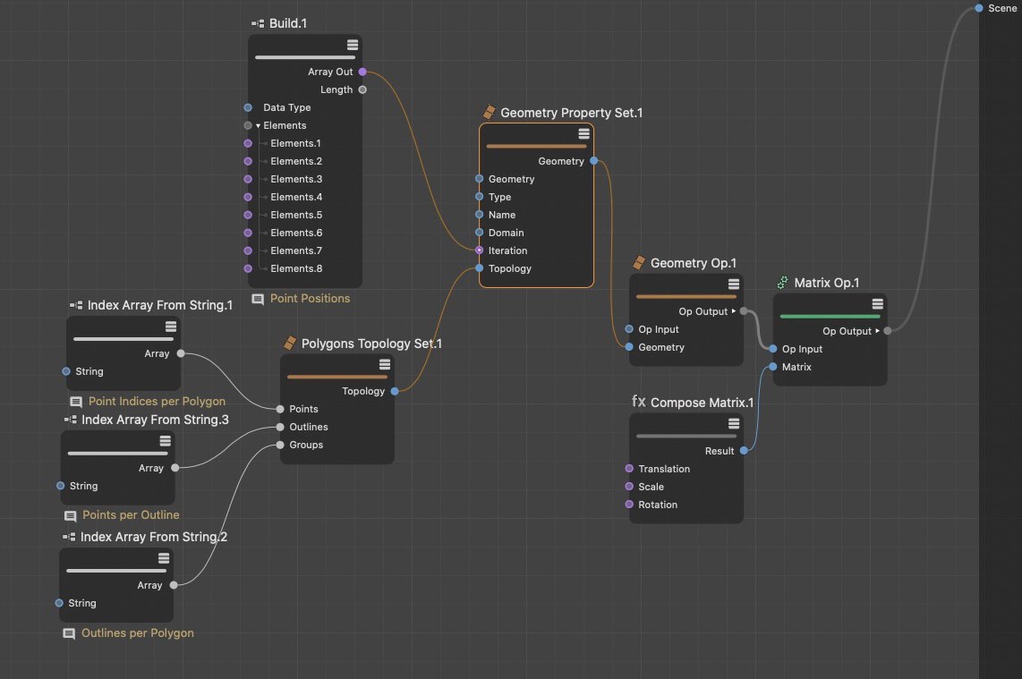 El nodo Conjunto de topología de polígonos se puede utilizar para establecer los números de los puntos que pertenecen a un polígono determinado. Dado que esta serie de números no contiene información sobre, por ejemplo, si los polígonos deben crearse como triángulos o quads, tendrá que agregar una matriz que contenga el número de puntos para cada polígono que tenga bordes continuos. Esta información se denominará Borde en el nodo. Finalmente, falta la información sobre el número de bordes que debe tener el polígono. Normalmente, esto solo será un borde, pero por supuesto, también se pueden generar N-Gons que tengan un agujero. En este caso, se definirá un borde para la forma exterior del N-Gon y un borde para la abertura. Esta información se denominará Grupos en el nodo. En conjunto, la información sobre los índices de puntos, los bordes y los grupos se denomina Topología y se puede combinar para crear geometría a través del Nodo Conjunto de propiedades de geometría. Para hacerlo, se debe establecer la posición de todos los puntos. Para esto, se requerirá nuevamente una matriz que se define a través de un nodo de compilación como se ve en la imagen a continuación.